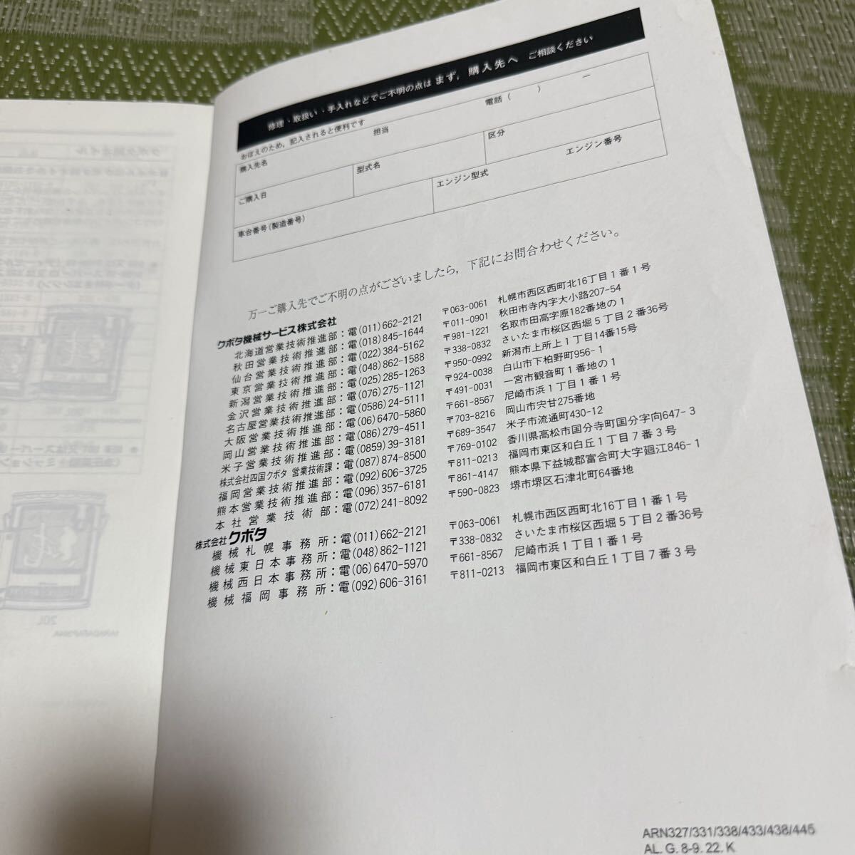 クボタ コンバイン ARN327.331.338.433.438.445 エアロスター 取扱説明書