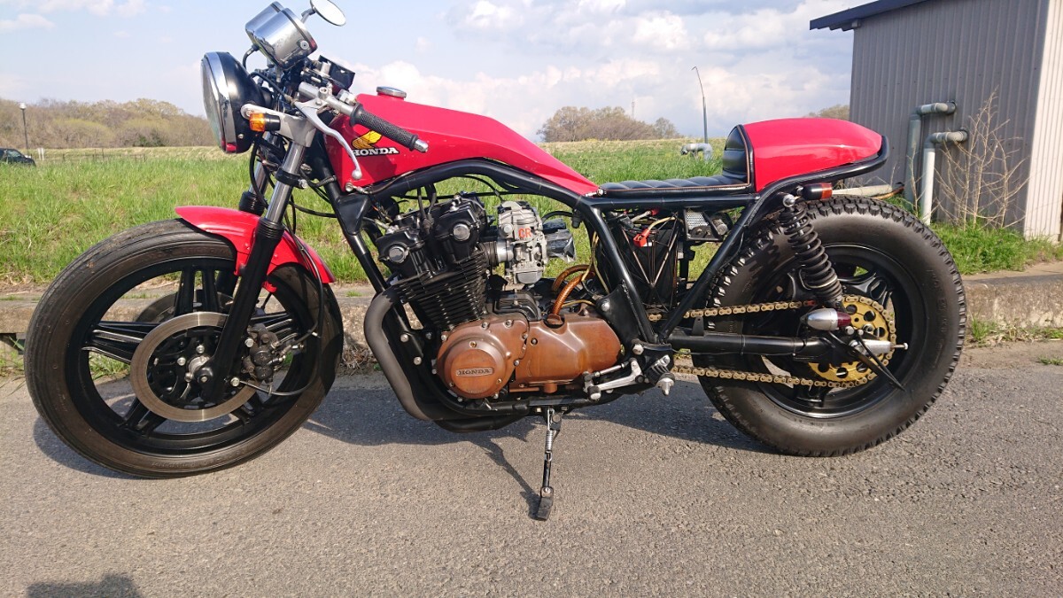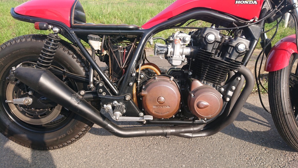 チョッパーカスタムのCB750fになります車検証情報車名 ホンダ車体番号 RC04-103※※※※型式 RC04原動機 RC01E排気量 0.74L乗車定員 1人走行距離 7800Km(不明)カスタム内容マフラー集合管 メガホンサイレンサーキャブレター ケイヒンCR41 ファンネルゴールドチェーン アファムアルミスプロケリアサスペンションF ニッシンブレーキマスターF R ステンメッシュブレーキホースデイトナ ミニタコ スピードメーターワンオフ サイドナンバーステーメインキー位置 変更フレーム加工ワンオフ シングルシート外装 レッド塗装