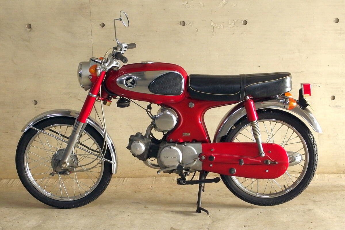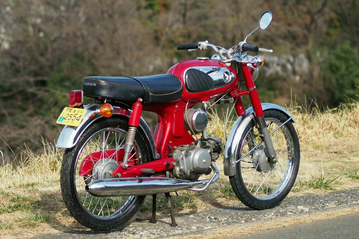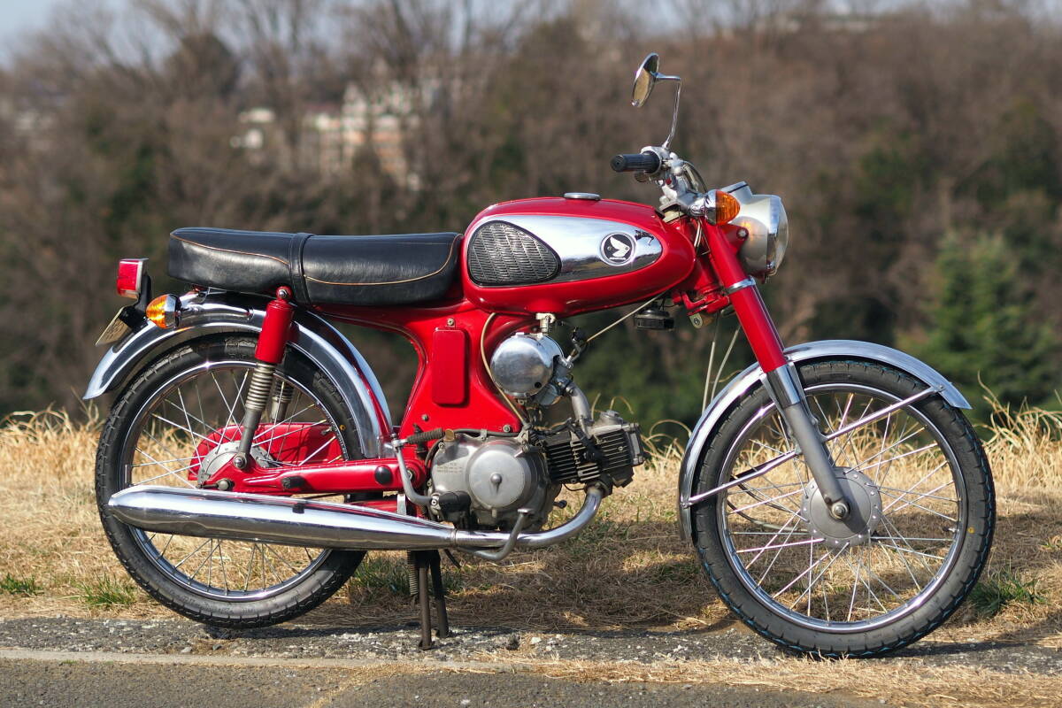 1967年型のCS90Zです。 10年前の購入時に表面に錆が出ていたのでフレーム以外を再塗装しています。 遠目にはとても綺麗な車体ですが、 ハンドルバーやタンクサイドのメッキ表面等に薄く錆が出ています。 (ハンドルバーはこれ以上錆ないよう表面処理しています) また錆びの酷かった部品には銀塗装をしています。 乗っていて部分的に付いた小さな傷をスポッティングした痕があります。 ホイールとスポークは、かなり錆てきたので昨年前後新品と交換しました。 その時に前後タイヤも新品と交換しています。 リアフェンダーも錆...
