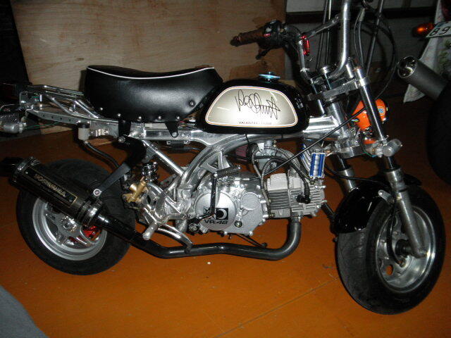 モンキーですがかなり加工してあります委託出品ですわかる範囲で質問にはお答えしますアルミフレームですリアキャリアもアルミですタンクにはバレンティ-ノロッシのサインがあしらってありますヨシムラのマフラー以外新品パーツで組んであります片持ちアルミスイングアームが付いていますブレーキペダルにGクラフトと書いて有りますフロントフォークはデイトナです組み立て後テスト走行で1~2キロ走っただけで後はディスプレイとして展示してありましたバッテリーレスキットが組んでありますプロの整備士が組み立てています後は見て...