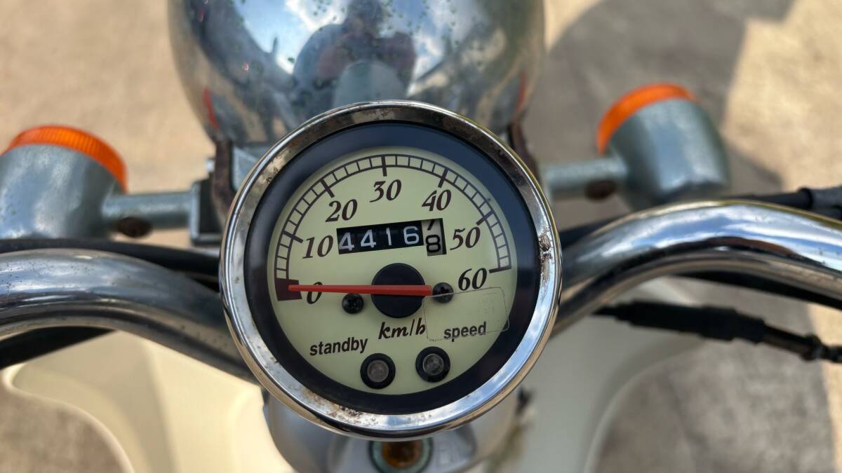 知人から譲り受けましたが結局乗ることもなく。3年以上放置していましたので整備・出品します。現状、キック数発で始動・30km/hまでの加速も良好です。(気温18度くらいならチョーク無しで始動します)※ワタシ体感的にはボアアップ済なトルクだと思います。他ウィンカー・ホーン・テールランプ・ヘッドライトも動作確認済み。ナンバー取得すれば、現状で普通に公道走行できる状態だと思います。整備内容は・燃料タンクは錆取り処理済・バッテリー新品交換・オイル交換済み・キャブレター・分解オーバーホール済・前後ブレーキ・分解オ...