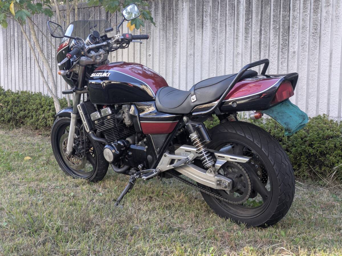 スズキインパルス400 GK79A 商品詳細 是非とも現車確認お願いします。 場所は東京都八王子市となります。 車検 令和9年6月まで。 走行距離 約33647km 初年度登録平成6年 型式:GK79A エンジン型式:K715 車庫内で保管です。 付属品は、車検必要書類,パーツカタログ、サービスマニュアルがあります。 鍵は、メイン、タンク、シート全て同じキーです。 現状で車検を通しておりますが、年式による劣化は有ります。 改造箇所はおおまかに ・外装オールペンしオリジナルです。 ・マフラー2本(車検対応ヨシムラ...